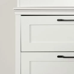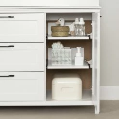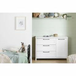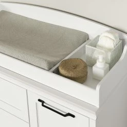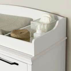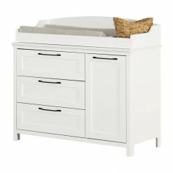 Changing table gives you ample storage, and grows with your childWe always want what’s best for baby – so trust us, this changing table is a real “must” for any new parents. You can store all of baby’s essentials in the 3 large drawers on metal slides. Another plus: the cabinet has one fixed shelf and two sliding shelves that can hold up to 15lbs. You can pull out the sliding shelves to see what’s inside and easily find what you’re looking for. The rim is also set up with a special storage space, so you can keep your creams, diapers, and wipes close to you. It’s also removable: when your little one is old enough, you can take it off to convert this piece into an attractive dresser. Changing diapers may not be everyone’s favorite thing, but this table is sure to make the task a little easier!A safe dresser for babyGet this piece of furniture and you can be sure your newborn is in good hands. The rim will keep the changing mat in place, ensuring better stability for baby. Another plus: this piece lets you keep everything close at hand, so you don’t have to take your eyes off baby. Finally, this changing table is ASTM certified and meets all current safety standards.A cute Farmhouse pieceYou’ll fall in love with the Farmhouse style of this changing table, just like we did. We love the decorative details, such as the framed drawers and door, which add a soft, charming look to the piece. The delicate metal handles also contrast nicely with the rest of the design, while adding a super trendy touch.