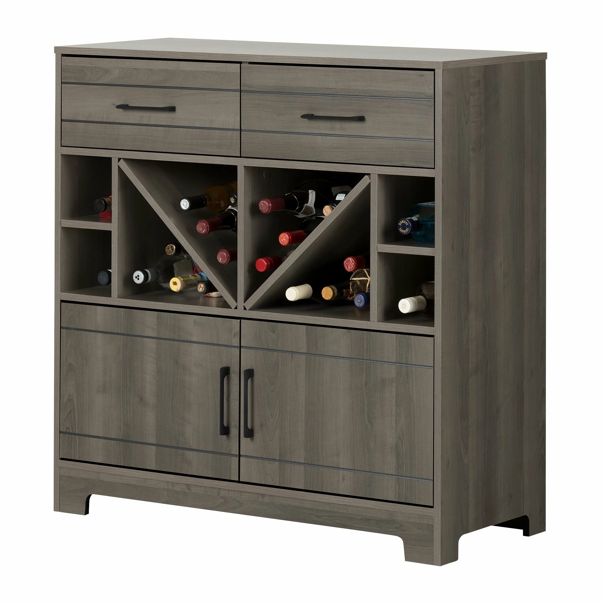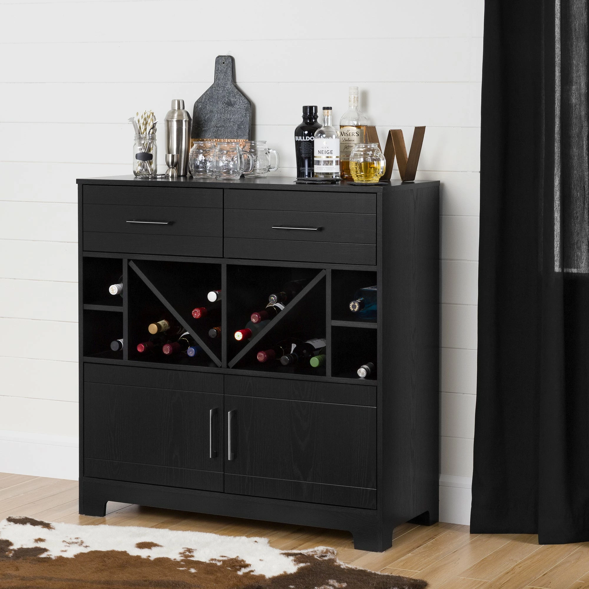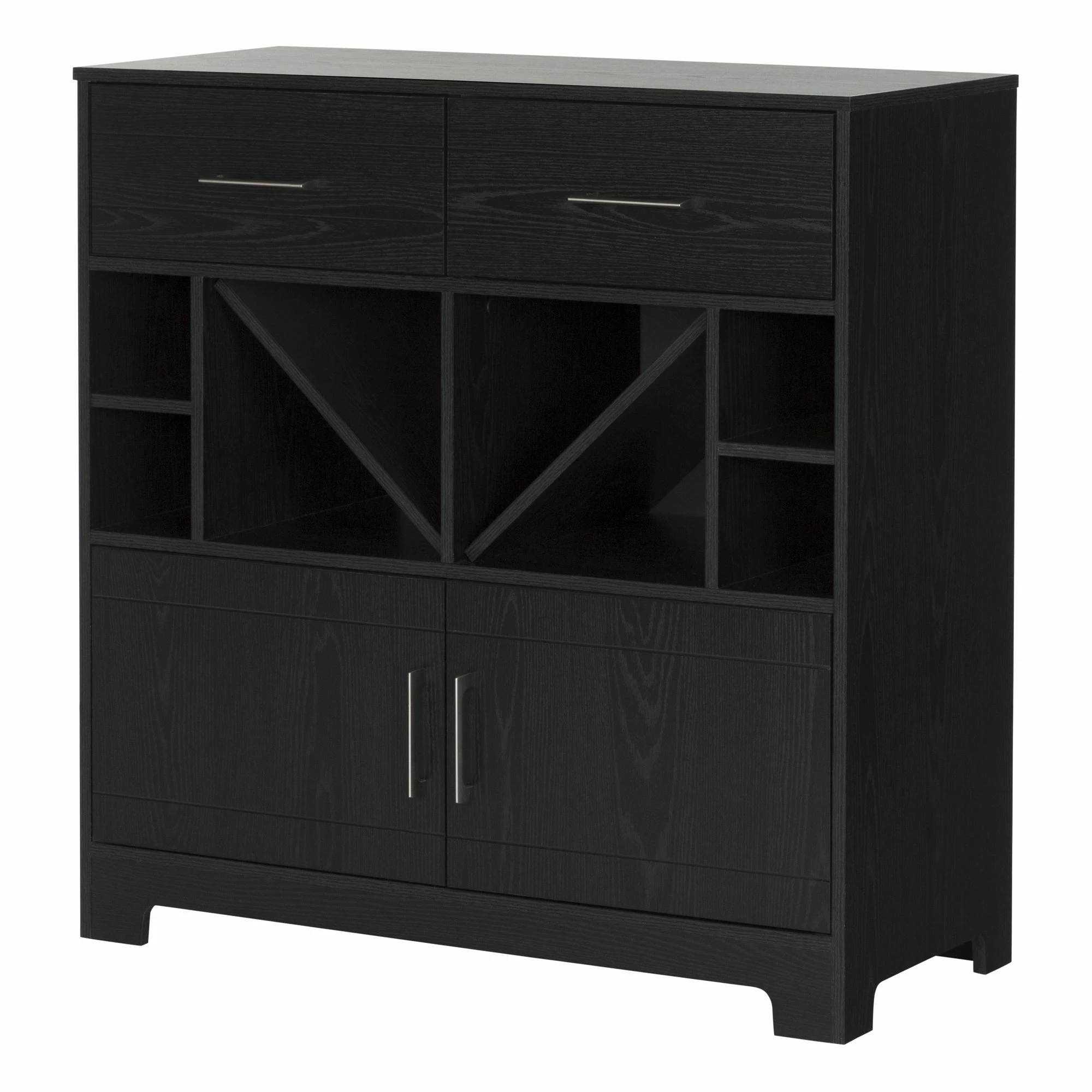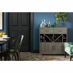 Celebrate the good life with the South Shore Vietti bar cabinet. This charming unit with open shelves that hold up to 32 bottles, two drawers, and two cabinets offers ample storage space for spirits and bar ware. Its sleek lines shout elegance, while a choice of black oak or grey maple finish complements your contemporary interiors.