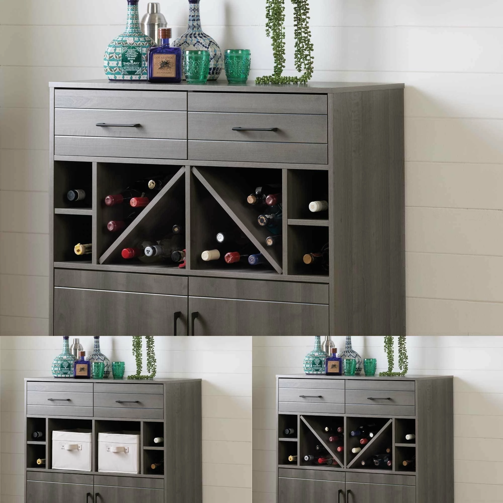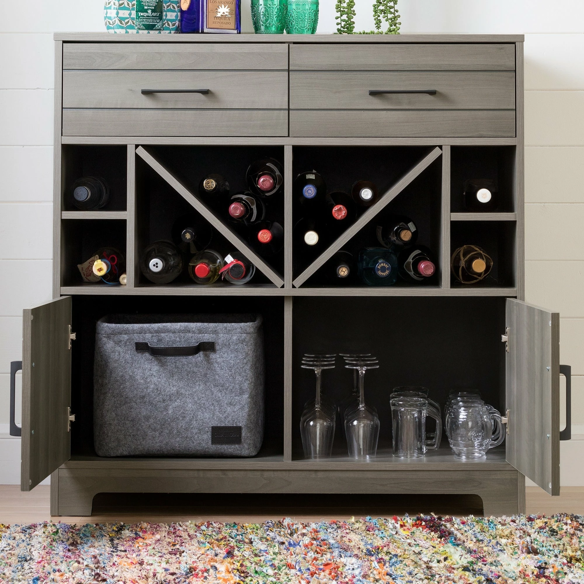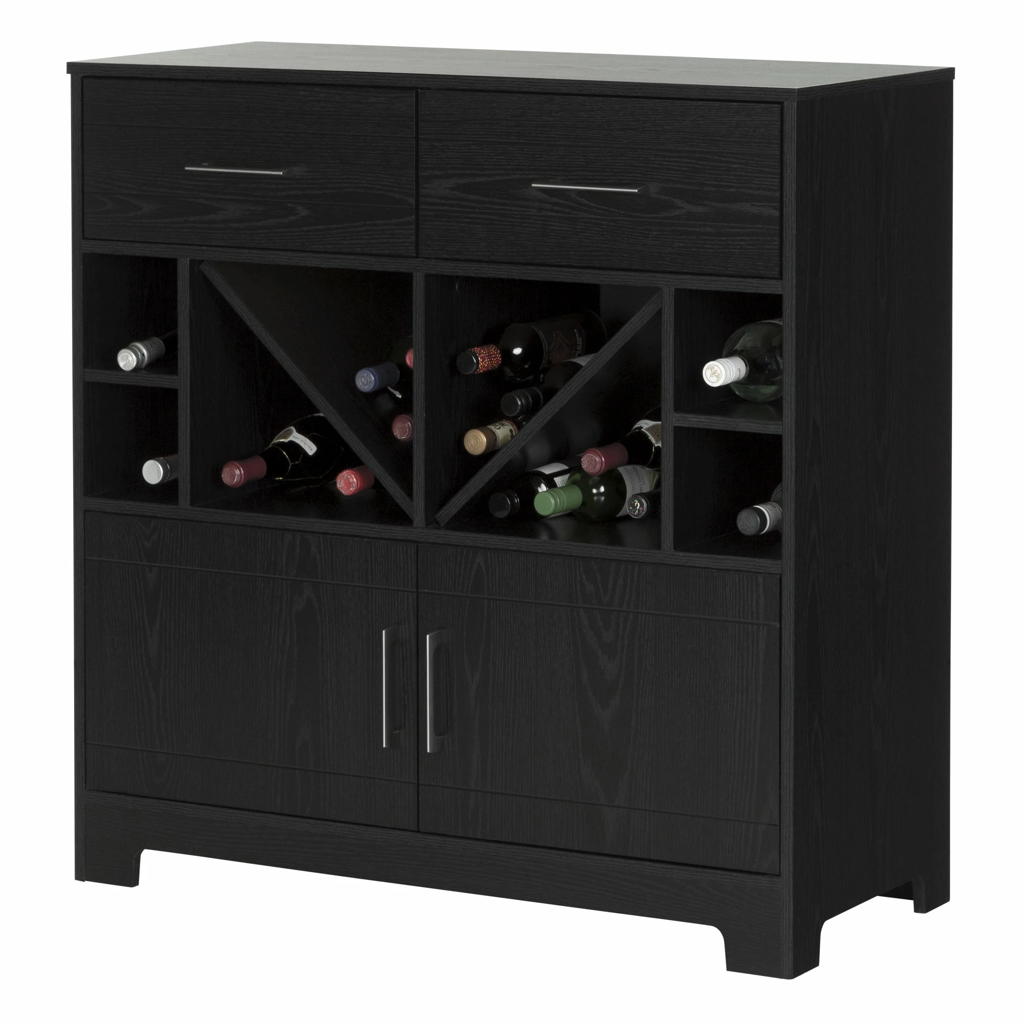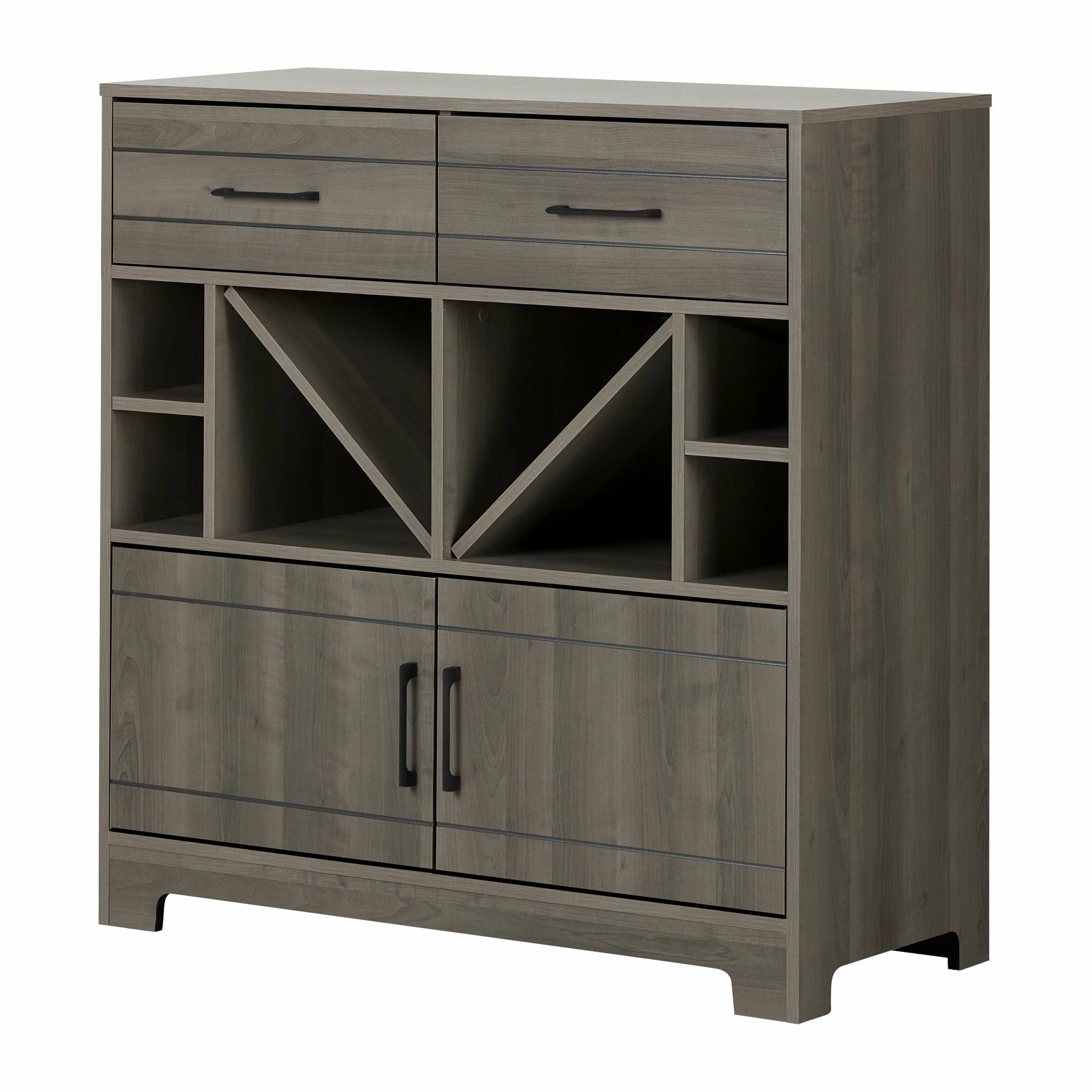 Celebrate the good life with the South Shore Vietti bar cabinet. This charming unit with open shelves that hold up to 32 bottles, two drawers, and two cabinets offers ample storage space for spirits and bar ware. Its sleek lines shout elegance, while a choice of black oak or grey maple finish complements your contemporary interiors.